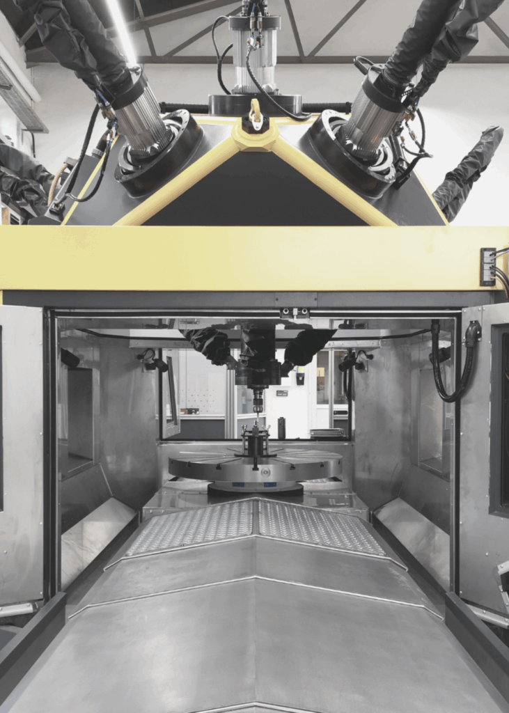 Sind Sie bereit, Ihre Produktion auf das nächste Level zu heben? Das Pentapod ist ein 5-Achs-Bearbeitungszentrum mit fünf Achsen im Werkzeug. Es ermöglicht eine leistungsstarke 5-Seiten- und simultane 7-Achs-Bearbeitung (mit zwei Tischachsen) und ist damit die Lösung, nach der Sie gesucht haben.