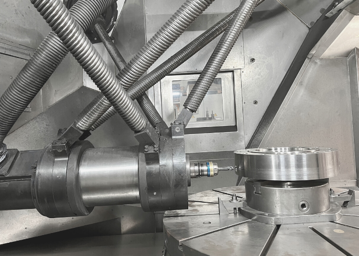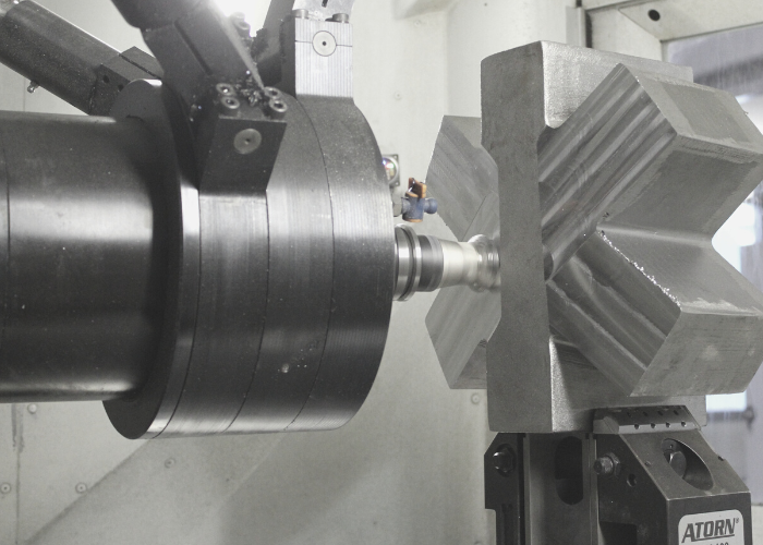 Die Spindel ist horizontal bis zu 90° in eine Richtung schwenkbar und ermöglicht mit Hilfe eines Rundtisches (6. Achse) die komplette 5-Seiten-Bearbeitung des Bauteils.